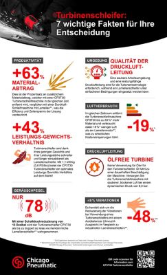 Diese Infografik soll den Beteiligten in der Metallverarbeitung, im Schienenverkehr, in Werften und Gießereien dabei helfen, zu entscheiden, ob die Turbinenschleifer-Technologie die richtige Wahl für ihren Betrieb ist. Durch den Vergleich des industriellen Turbinenschleifers CP3T30 von Chicago Pneumatic mit herkömmlichen Lamellenschleifern heben wir wichtige Leistungskennzahlen wie Materialabtragseffizienz, Luftverbrauch, Vibrationsreduzierung und Schalldruckpegel hervor.